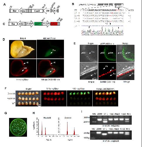 在此基础上,本团队研究人员构建了胚特异表达绿色荧光蛋白和胚乳特异表达红色荧光蛋白的双荧光标记表达盒(DFP),并通过农杆菌介导稳定遗传转化获得了单拷贝的双荧光标记转基因株系。进一步将DFP标记和创制的单倍体诱导系杂交聚合,选育出了多个可以基于双荧光标记筛选受体单倍体的高频单倍体诱导系。本研究为创制的高频诱导系配套了稳定表达的DFP单倍体筛选与鉴定标记,该标记可以应于幼胚、成熟种子水平筛选与分离单倍体籽粒,采用该标记也可以在田间开放授粉条件下,实施DH育种的单倍体诱导与筛选工作,大大地提高了工作的弹性,降低了工作量,提高了工作效率。同时也通过体外试验证明,该DFP标记也扩展应用于水稻、小麦与大麦等禾本科作物,为这些禾本科作物高效双单倍体育种技术奠定了重要技术基础。