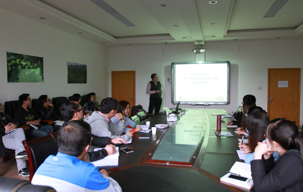 访问期间,Hopkins教授为节水中心科研人员做了题为“Addressing the yield gap in arable production—healthy soil for healthy agriculture”的报告。报告认为土壤和土壤健康是一个全球性的问题,关系到粮食生产的可持续性。Hopkins教授通过英国洛桑试验站百年长期定位实验数据,分析了自1840年以来由休耕、除草剂、现代栽培和杀菌剂等不同措施引起小麦产量的变化情况及英国的潜在产量与实际田间产量的差异性,并指出导致该差异的原因——土壤中出现的养分枯竭、有机质减少及土壤侵蚀等问题。报告会引起了老师和同学们的浓厚兴趣,会后与Hopkins教授积极讨论。